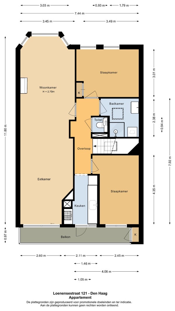 • De portiekwoning heeft een woonoppervlakte van 87 m² en beschikt over 3 kamers, waarvan 2 slaapkamers;