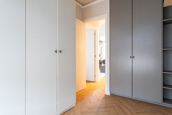 The living room is spacious and bright and, together with the luxurious semi-open kitchen, forms a pleasant living area. The kitchen is equipped with various built-in appliances. Both the living room and the kitchen provide access to the balcony, a lovely spot to sit outside.