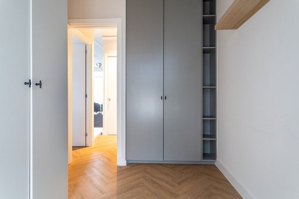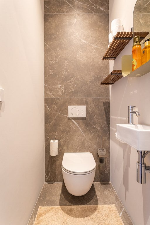 Op de gang bevinden zich een separaat toilet en een aparte wasruimte met aansluiting voor wasmachine en droger. Het gehele appartement is voorzien van vloerverwarming en dubbel glas, wat bijdraagt aan het comfortabele woonklimaat.
