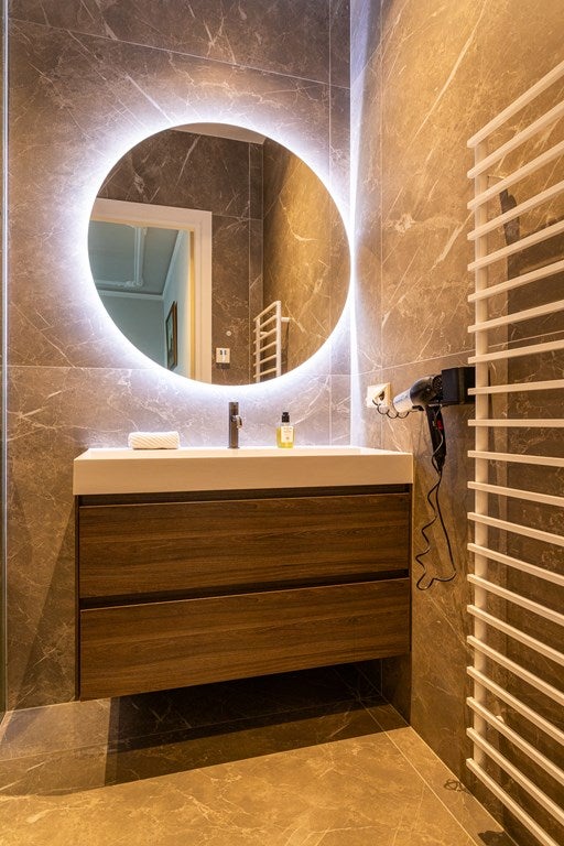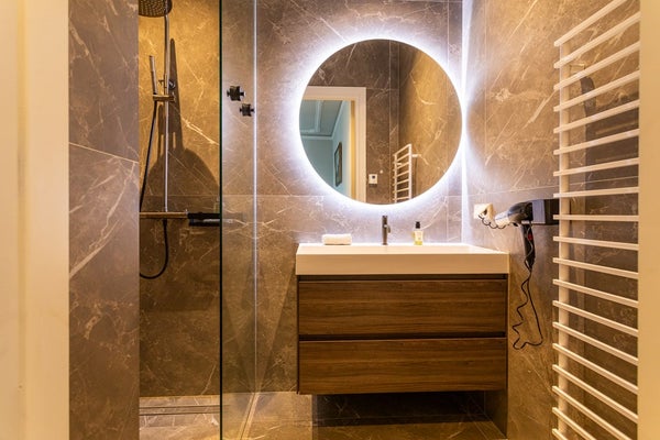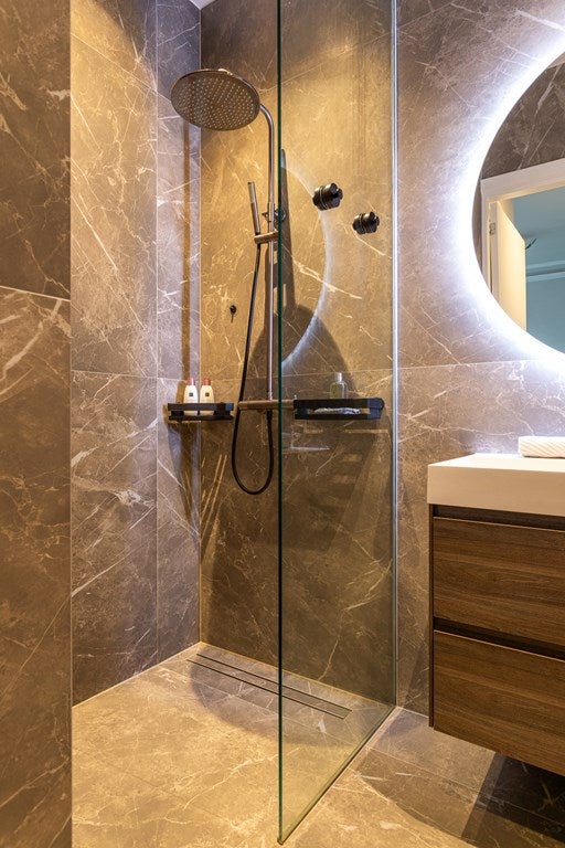 At the front of the apartment are two bedrooms, one of which is fitted with built-in wardrobes. From the bedrooms there is direct access to the sleekly finished bathroom, which features a spacious walk-in shower and washbasin.