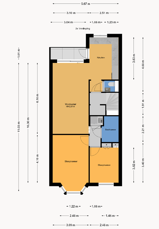 - De bovenwoning heeft een woonoppervlakte van 60 m² en beschikt over 3 kamers, waarvan 2 slaapkamers;
