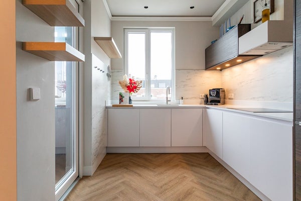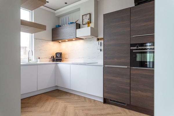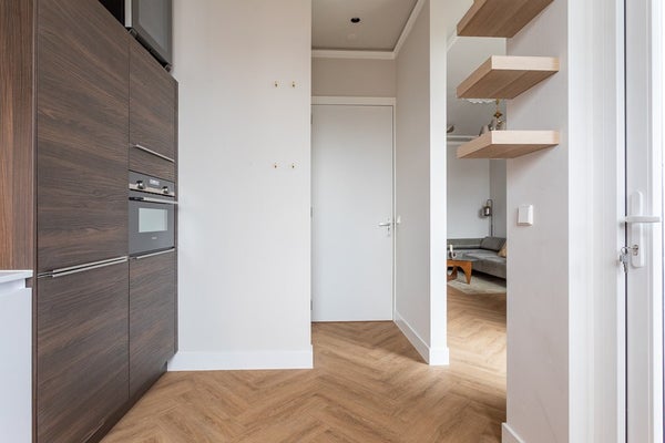 De woonkamer is ruim en licht en vormt samen met de luxe halfopen keuken een prettige leefruimte. De keuken is voorzien van diverse inbouwapparatuur. Vanuit zowel de woonkamer als de keuken is er toegang tot het balkon, een fijne plek om buiten te zitten.