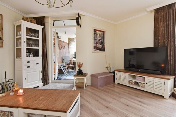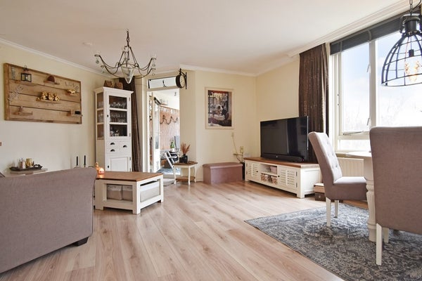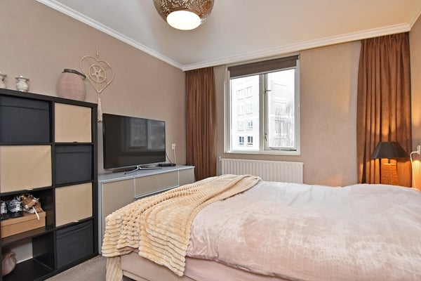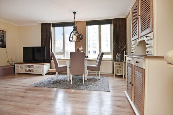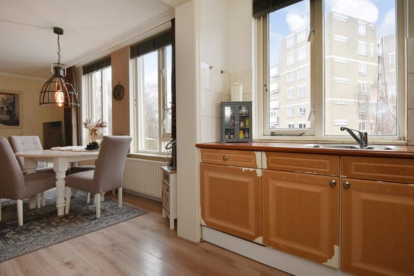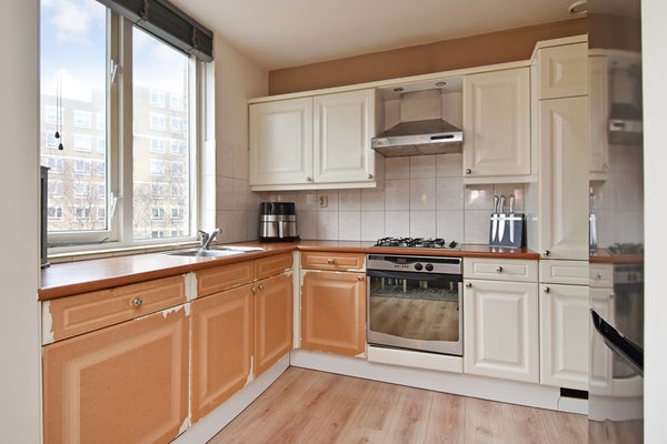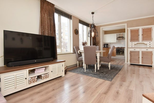 De lichte woonkamer is voorzien van een laminaatvloer en biedt een vrij uitzicht over de singel. Vanuit de woonkamer is er toegang tot het zonnige balkon aan de voorzijde. De halfopen keuken is modern uitgevoerd en voorzien van diverse inbouwapparatuur, waaronder een vaatwasser, koel-/vriescombinatie, oven en gasfornuis.