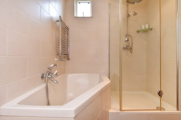 De volledig betegelde badkamer beschikt over een douche, ligbad en vaste wastafel.