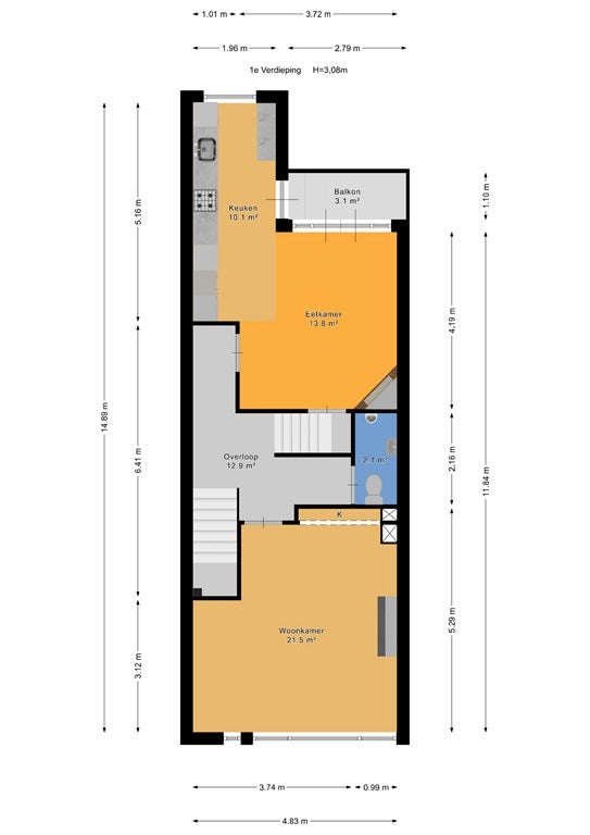 - De bovenwoning heeft een woonoppervlakte van 125 m² en beschikt over 5 kamers, waarvan 3 slaapkamers;