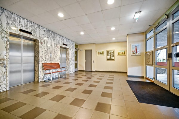 Ruime moderne gemeenschappelijke entree met twee royale liften en trappenhuizen naar de verdiepingen.