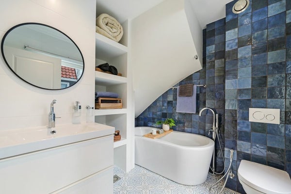 De prachtige, luxe tweede badkamer is voorzien van een ligbad, wastafel en toilet.