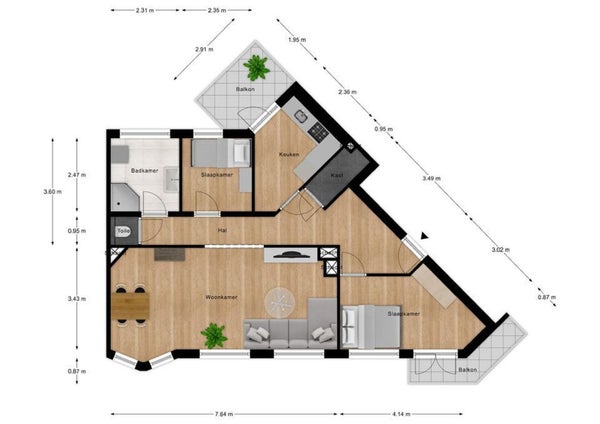 - De galerijflat heeft een woonoppervlakte van 73 m² en beschikt over 3 kamers, waarvan 2 slaapkamers;