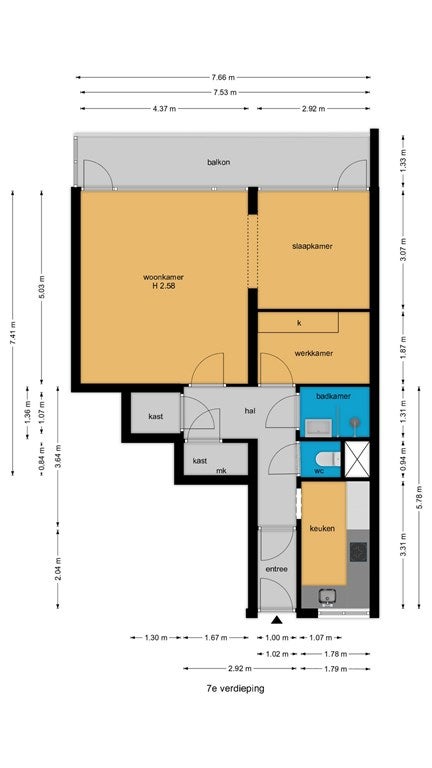 - De galerijflat heeft een woonoppervlakte van 60 m² en beschikt over 2 kamers, waarvan 1 slaapkamer;