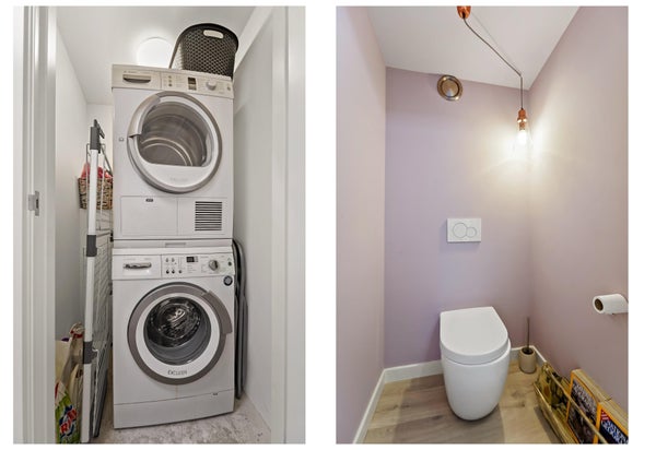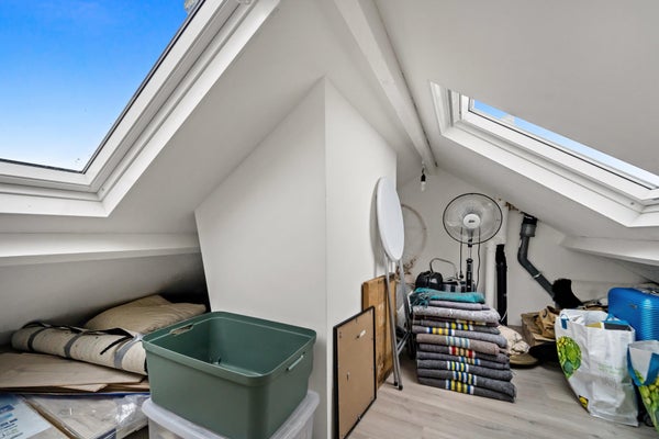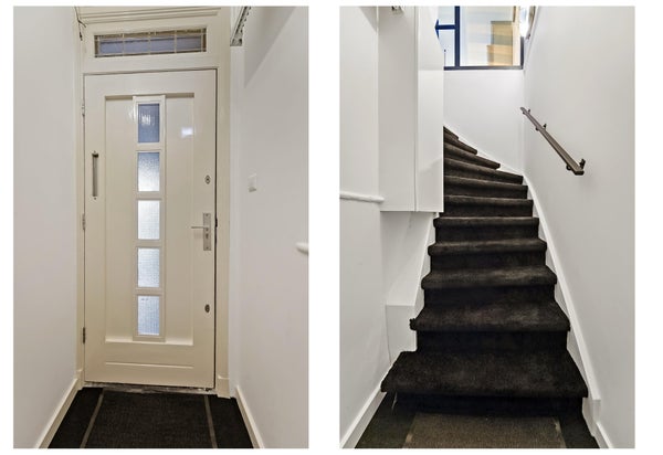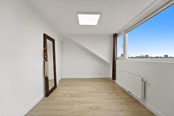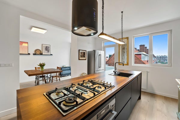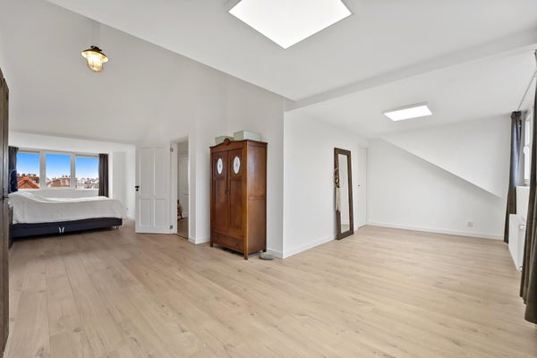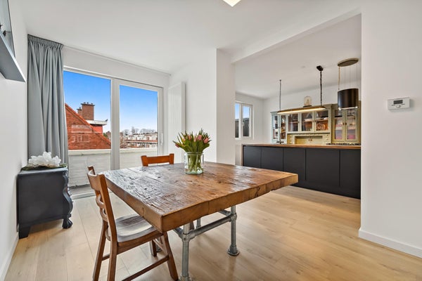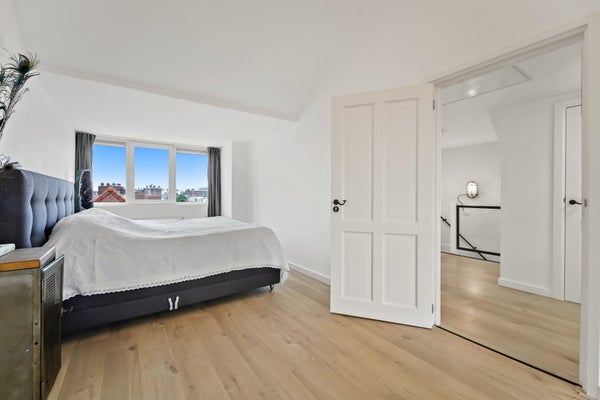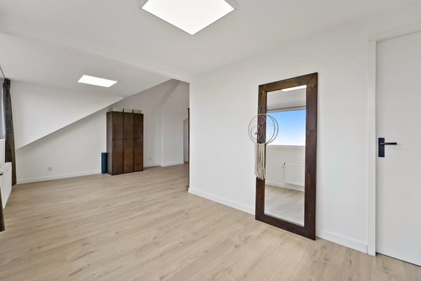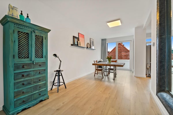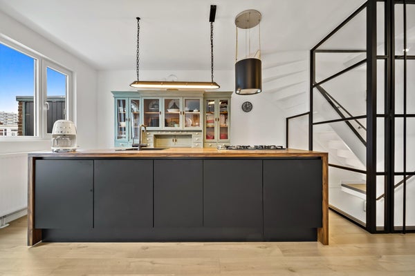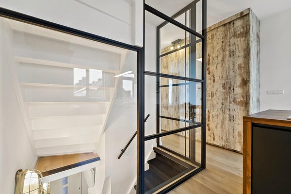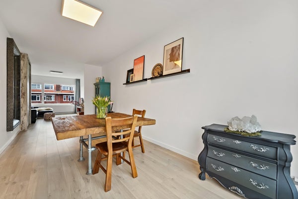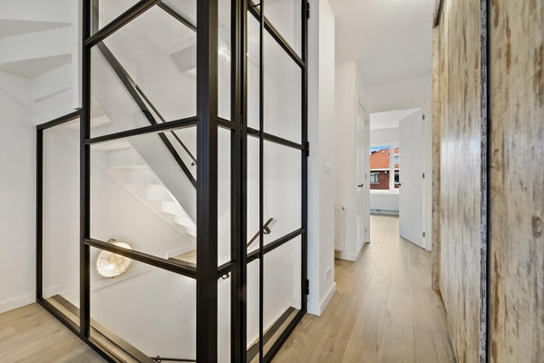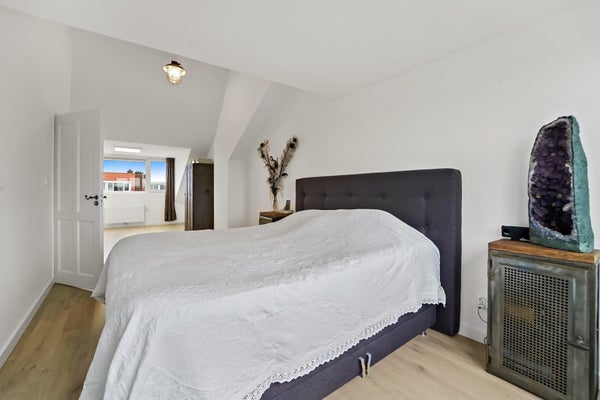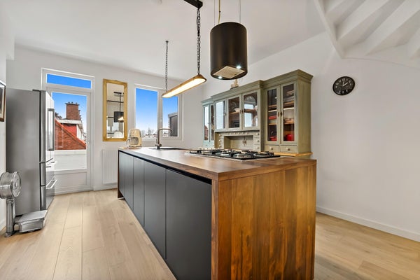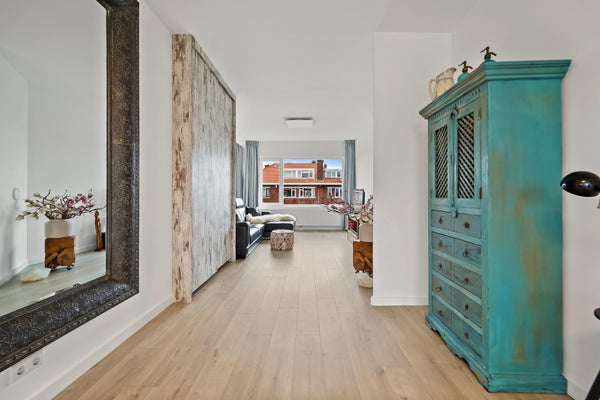 Layout: The Hague-style porch with stairs to the first floor. Entrance hall with meter cupboard. Stairs to the second floor. Entrance through a steel door. Hallway with built-in wardrobes and access to the beautiful kitchen/diner. The kitchen is fully equipped, including a modern gas cooktop, a Quooker, a dishwasher, an extractor hood, an oven, and a door to the balcony. The dining room is located at the rear of the house, with sliding doors leading to the balcony and a storage cupboard. The L-shaped living room is spacious and features a former en-suite bathroom, creating a playful layout with a through-the-floor feel. Large windows provide abundant natural light. Back in the hallway, you'll find a very spacious toilet. Stairs lead to the second floor. A very spacious landing leads to the generous bedroom with large dormer windows, offering the possibility of creating multiple bedrooms. Back in the hallway, you'll find a separate toilet, laundry room, and bathroom. A loft ladder provides access to the attic, which features skylights and ample storage space. The modern bathroom features a walk-in shower, vanity, and a heated towel rail.