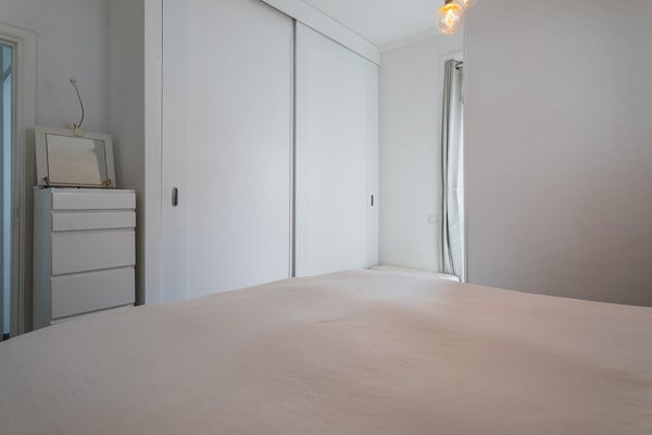 Behind the living room is a hallway with a granite floor giving access to two comfortable bedrooms, a modern separate toilet with washbasin, and a luxurious bathroom. The bathroom features a bathtub, a generous rain shower and double natural-stone washbasins, and is also equipped with electric underfloor heating for extra comfort.