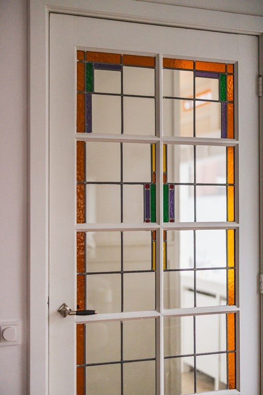 Through the entrance you enter the hallway, which leads to the bright living/dining room with open-plan kitchen. The space has a warm and characterful atmosphere thanks to the stained-glass doors and transom windows, combined with elegant decorative ceiling mouldings. This is the heart of the home: a wonderful place to live, dine and come together.