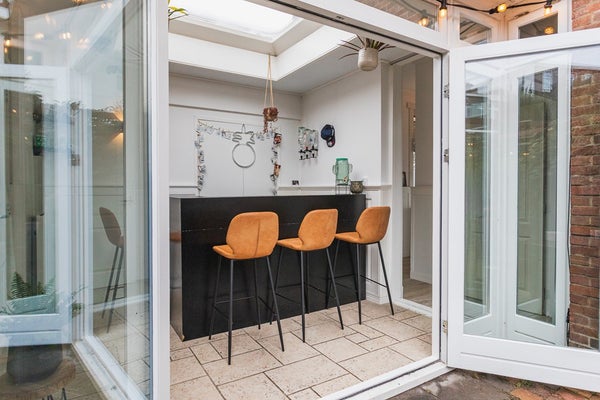 The intermediate section has been fitted with a custom-made bar and French doors opening onto the back garden. This space is ideally suited as an extra bedroom, home office or hobby room. The rear extension is currently used as a spacious home office, but can easily be converted into a full third bedroom.