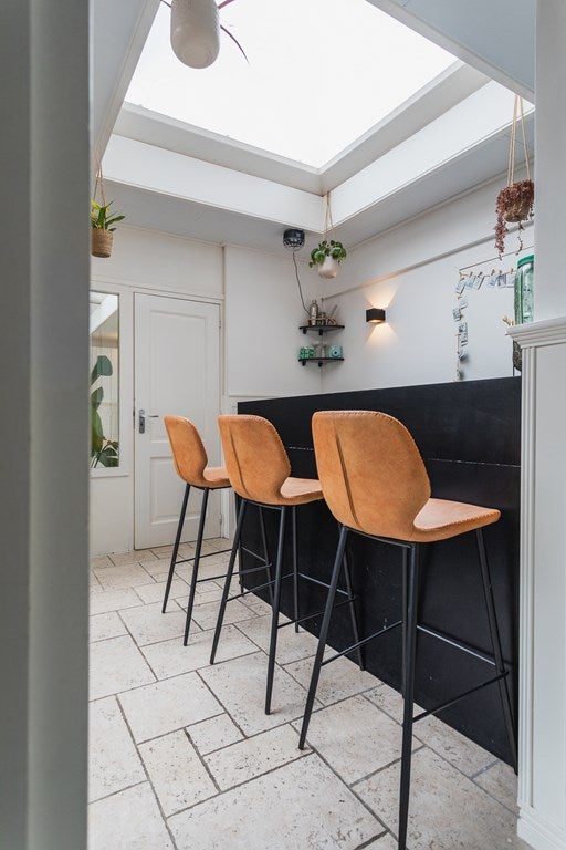 De tussenbouw is ingericht met een op maat gemaakte bar en openslaande deuren naar de achtertuin. Deze ruimte leent zich uitstekend als extra slaapkamer, werkplek of hobbyruimte. De achterbouw is momenteel in gebruik als ruime kantoorruimte aan huis, maar kan eenvoudig worden ingericht als volwaardige derde slaapkamer.
