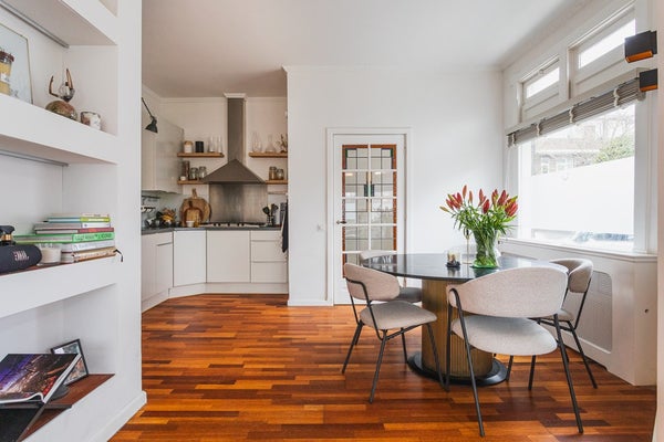 Via de entree komt u in de hal die toegang geeft tot de lichte woon-/eetkamer met open keuken. De ruimte ademt sfeer door de glas-in-lood deuren en bovenlichten, gecombineerd met fraaie plafond sierlijsten. Dit is het hart van de woning: een fijne plek om te wonen, te eten en samen te komen.