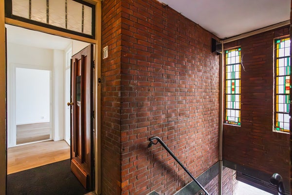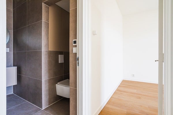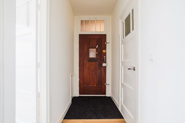 Entree op de 1e woonlaag. Direct bij binnenkomst vind je aan de rechterzijde de eerste slaapkamer met toegang tot het eerste balkon. Naast deze slaapkamer ligt het separate toilet.