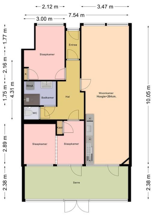 - De galerijflat heeft een woonoppervlakte van 94 m² en beschikt over 5 kamers, waarvan 2 slaapkamers;