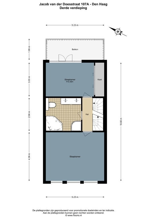 Derde verdieping: overloop, twee grote slaapkamers aan voor- en achterzijde, nette badkamer met ligbad/douche, dubbele wastafel en toilet. Vanuit de achterslaapkamer toegang tot het tweede balkon/terras.