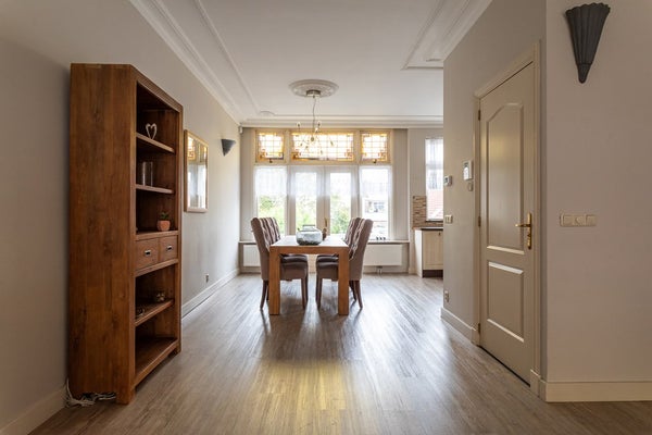 Eerste woonlaag (tweede verdieping): entree via open portiek en eigen opgang; hal met separaat toilet. Riante living aan de voorzijde (plafondhoogte ca. 2,90 m) met doorloop naar eetkamer en halfopen keuken aan de achterzijde. Via dubbele deuren toegang tot het eerste ruime balkon/terras.