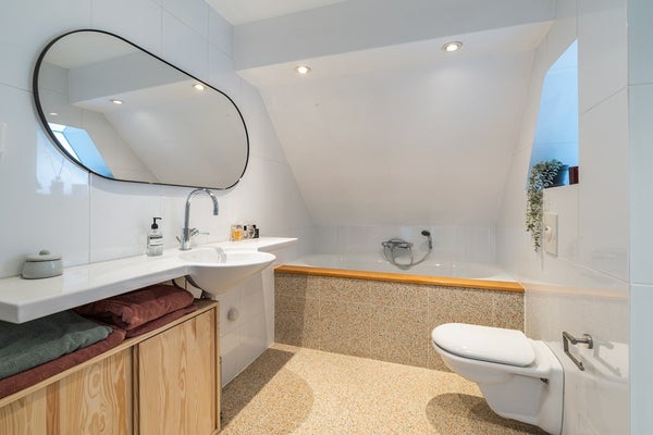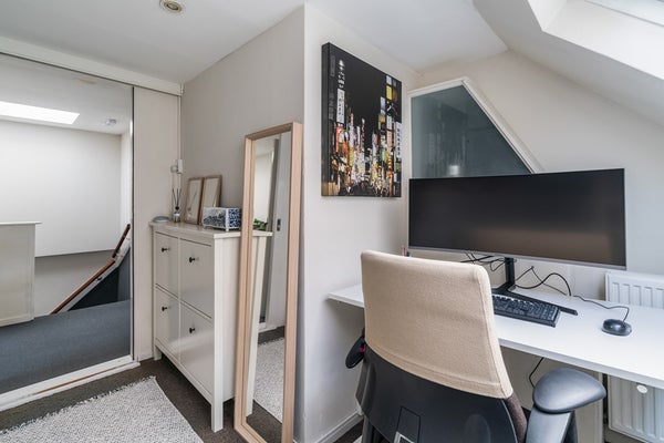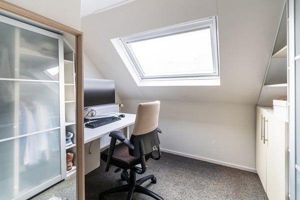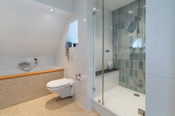Trap naar de 2e verdieping: overloop, ruime achterslaapkamer, moderne, recent gerenoveerde badkamer met inloopdouche, ligbad, toilet en wastafel in wastafelmeubel, ruime slaapkamer gelegen aan de voorzijde, 3e slaapkamer/werkkamer. Lichtkoepel.