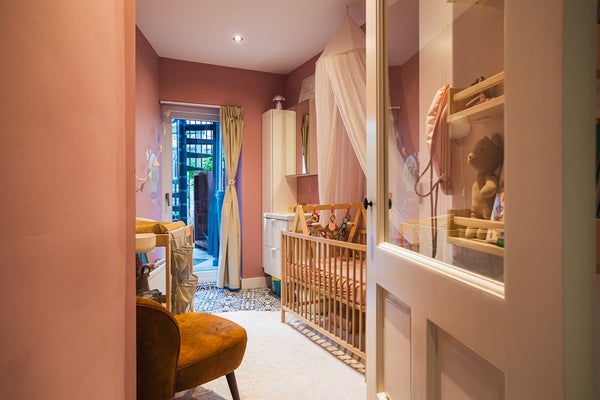 Through the double stained-glass doors, you enter the elegant living room with high ceilings, abundant natural light, a herringbone parquet floor and a wood-burning stove providing warmth and atmosphere. At the rear is the dining area with French doors opening onto the sunny terrace with stairs leading down to the deep back garden.