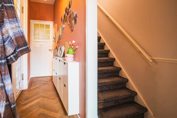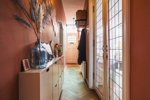 Via de voortuin bereik je de entree. In de hal bevinden zich het ruime toilet, de trap naar de eerste verdieping en de trap naar het souterrain.