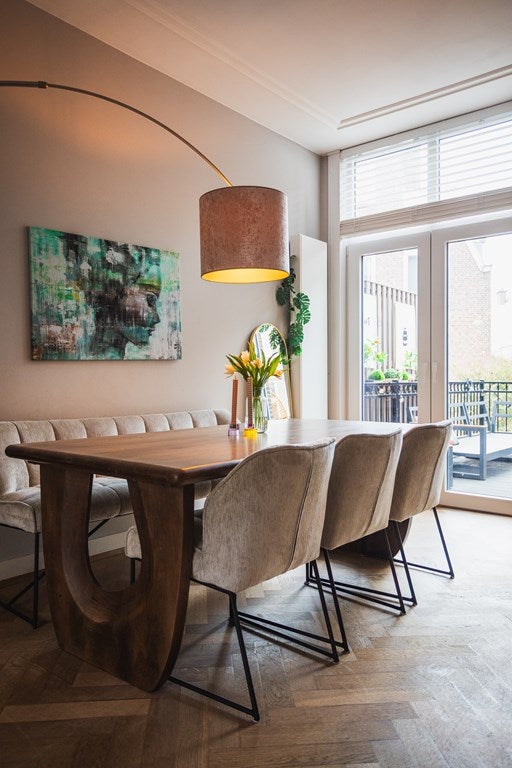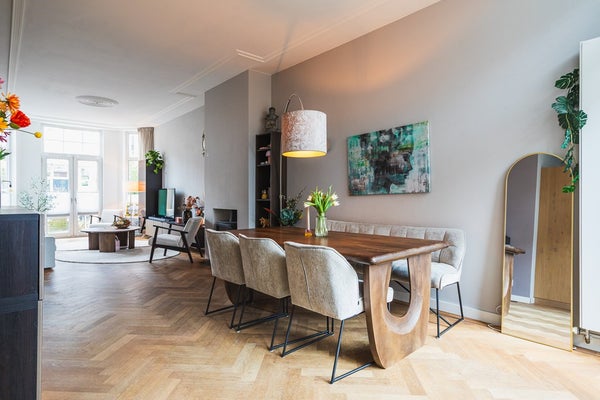 Via de dubbele glas in lood deuren bereikt u de sfeervolle woonkamer met hoge plafonds, veel lichtinval, visgraat parketvloer en een houtkachel die zorgt voor extra warmte en sfeer. Aan de achterzijde bevindt zich de eetkamer met openslaande deuren naar het ruime zonnige terras met trap naar diepe achtertuin.