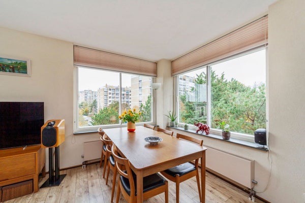 Dit royale 3-kamer maisonnette-appartement, gelegen vlak bij Kijkduin en het bos, biedt een zonnig terras, een parkeerplaats en een kelderberging. Gevestigd op de 3e en 4e verdieping van een verzorgd appartementencomplex, geniet de woonkamer van veel natuurlijk licht dankzij de hoekligging en grote ramen. De ruime hal leidt naar een inpandige berging en een toilet. De lichte woonkamer van ca. 30 m² heeft een open keuken met inbouwapparatuur. Op de bovenverdieping zijn er twee slaapkamers van ca. 13 m², met ruimte voor een derde slaapkamer. De badkamer beschikt over een douche en wastafelmeubel. Het terras van ca. 4.60 x 1.50 m op het zuidwesten maakt het compleet. Dit appartement is perfect voor wie comfortabel wil wonen in een groene omgeving dicht bij de zee. Woonoppervlakte is ca. 82 m².