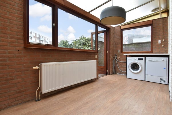De gemetselde uitbouw aan de achterzijde is voorzien van een golfplaten dak en biedt plaats aan de wasmachine en droger.