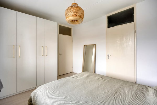 De ruime slaapkamer aan de achterzijde van het appartement biedt voldoende ruimte voor een tweepersoonsbed en kledingkasten. Het grote raam zorgt voor prettig licht en een aangenaam uitzicht.