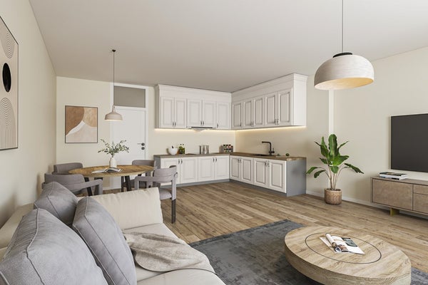 Overloop met doorloop naar de ruime en lichte woonkamer open keuken in L-opstelling en voorzien van diverse inbouwapparatuur waaronder een keramische kookplaat, afzuigkap, koel-vries combinatie, vaatwasmachine en combi oven-magnetron. Het terras grenst aan de woonkamer en ligt op het Noord Oosten. Aan voorzijde zijde bevindt zich 2 slaapkamers en in de gang bevindt zich tevens de badkamer met douche, vaste wastafel, toilet en de opstelplaats voor de wasmachine en droger.