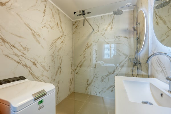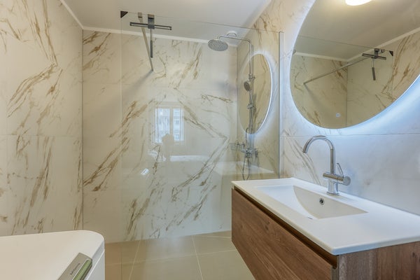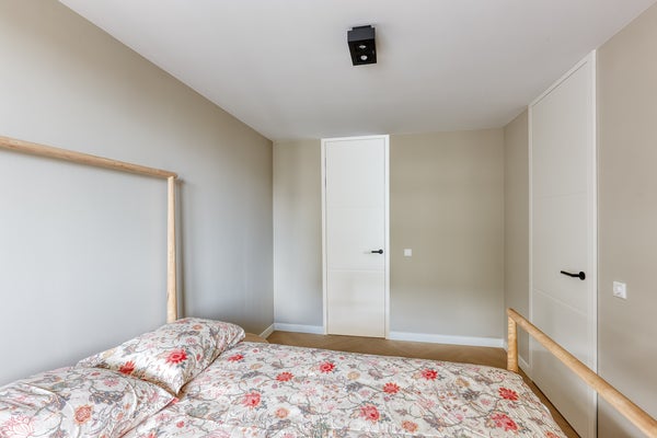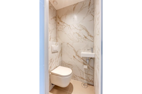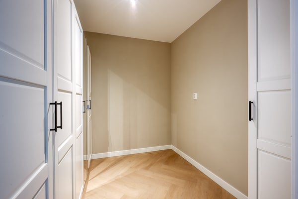 Tussenruimte met een kast over de volle breedte, welke zou kunnen worden gebruikt als logeerruimte. Aparte Easy clean toilet met fonteintje. Goede ruime slaapkamer met aansluitend de badkamer. Deze is voorzien van een ruime inloopdouche met o.a. een regendouche, wastafel met meubel en wasmachine. De plafondhoge binnendeuren hebben verborgen scharnieren.