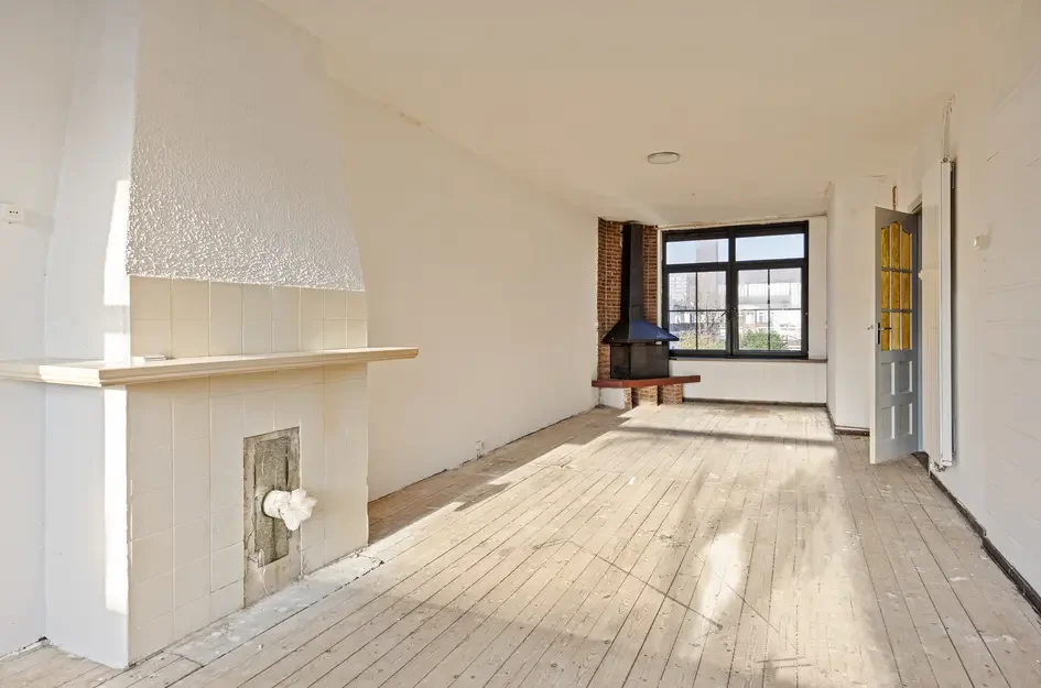 De eigen voordeur op de eerste etage leidt je via een vaste trap naar de tweede verdieping. Hier kom je binnen in een ruime hal met toegang tot alle vertrekken. De royale woonkamer aan de voorzijde is licht en heeft een open haard. Daarnaast is er een aansluiting voor een tweede gas- of moederhaard. De tweede slaapkamer bevindt zich aan de achterkant en biedt toegang tot het balkon. Keuken en badkamer zijn nog aanwezig.