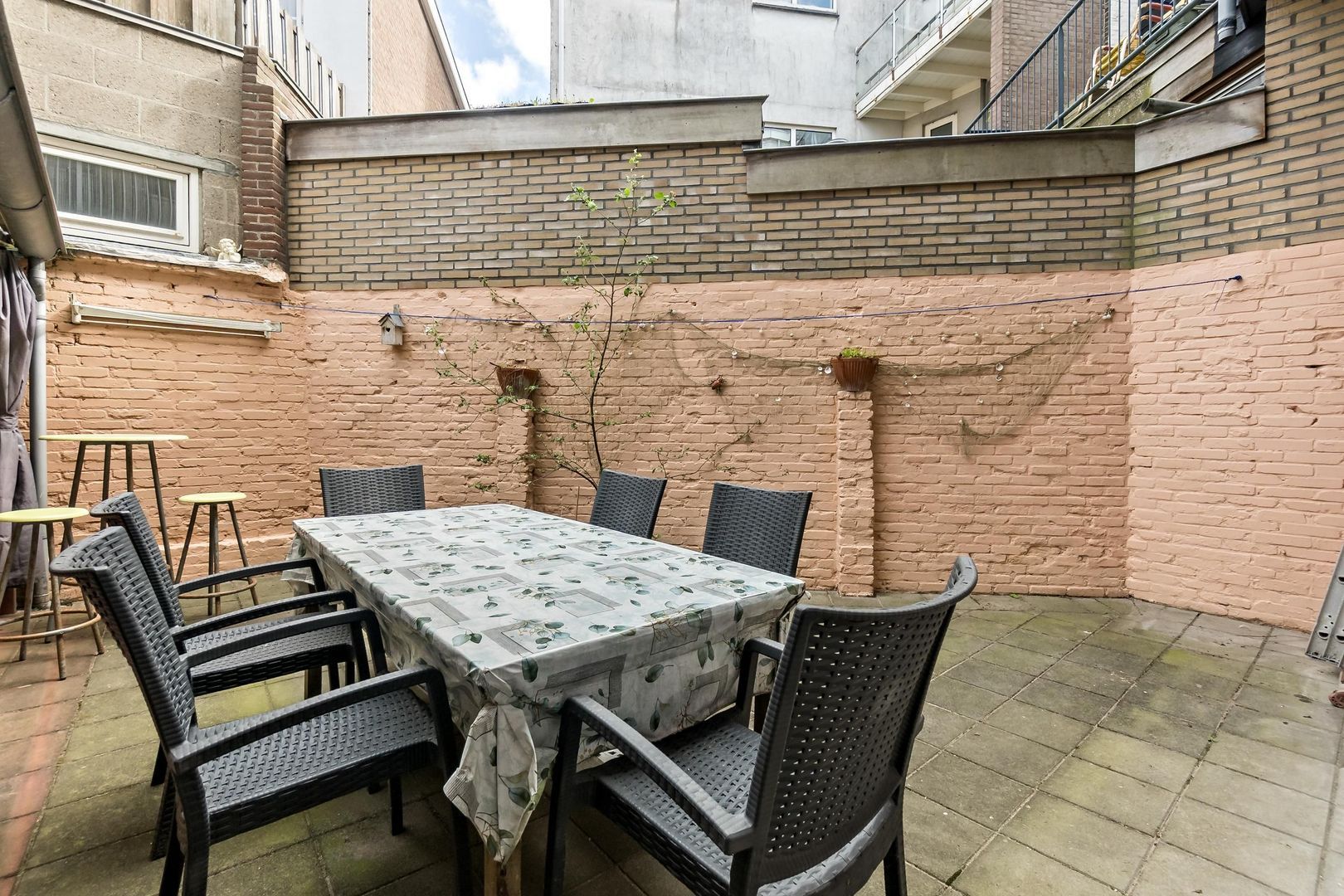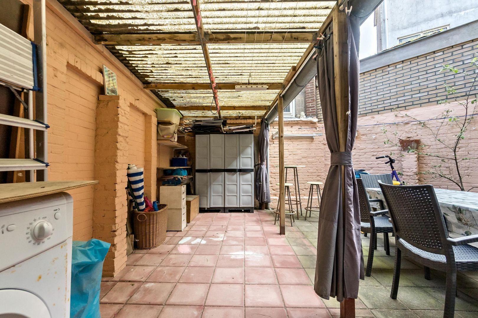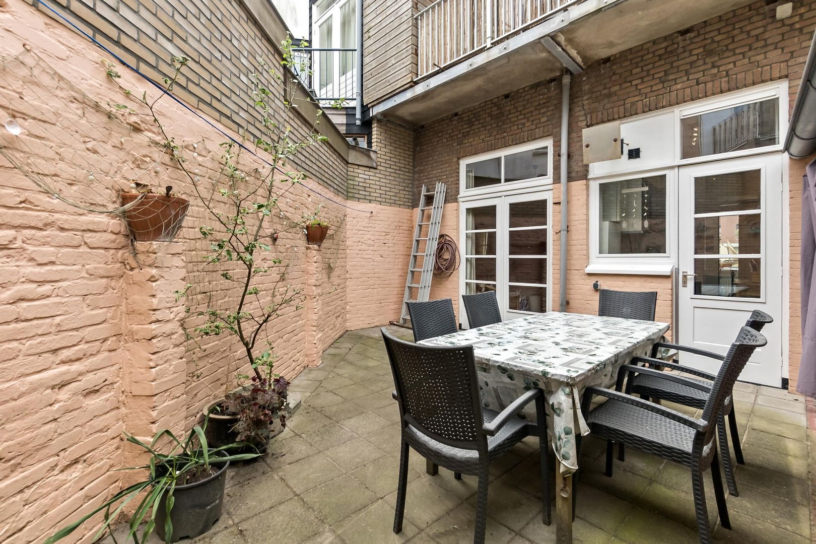 De woning heeft een indeling met entree, eetkamer met pantry en doorgang naar een hal met twee kamers, waarvan de voorkamer is ingericht als slaapkamer. De aantrekkelijke woonkamer heeft openslaande deuren naar de tuin, en de keuken is uitgerust met een kookplaat en vaatwasmachine. De badkamer beschikt over een douche en dubbele wastafels. Met een gebruiksoppervlakte van circa 63 m² en een actieve Vereniging van Eigenaren, biedt deze woning een comfortabele levensstijl.