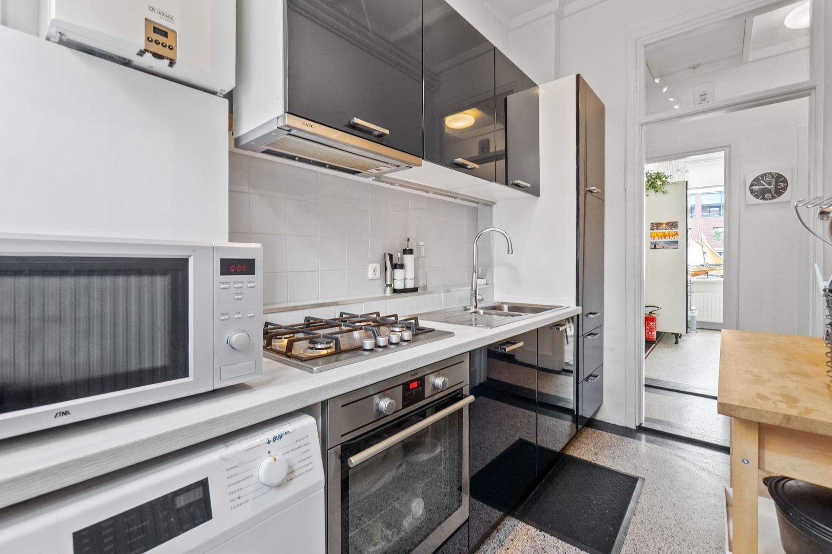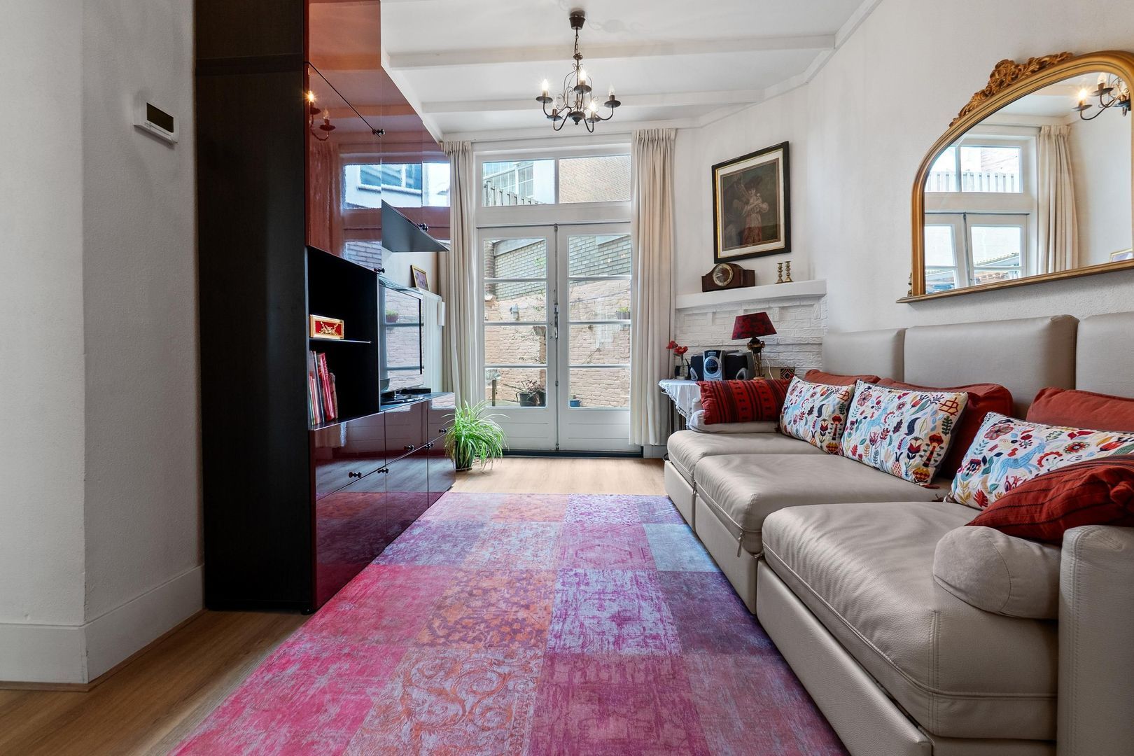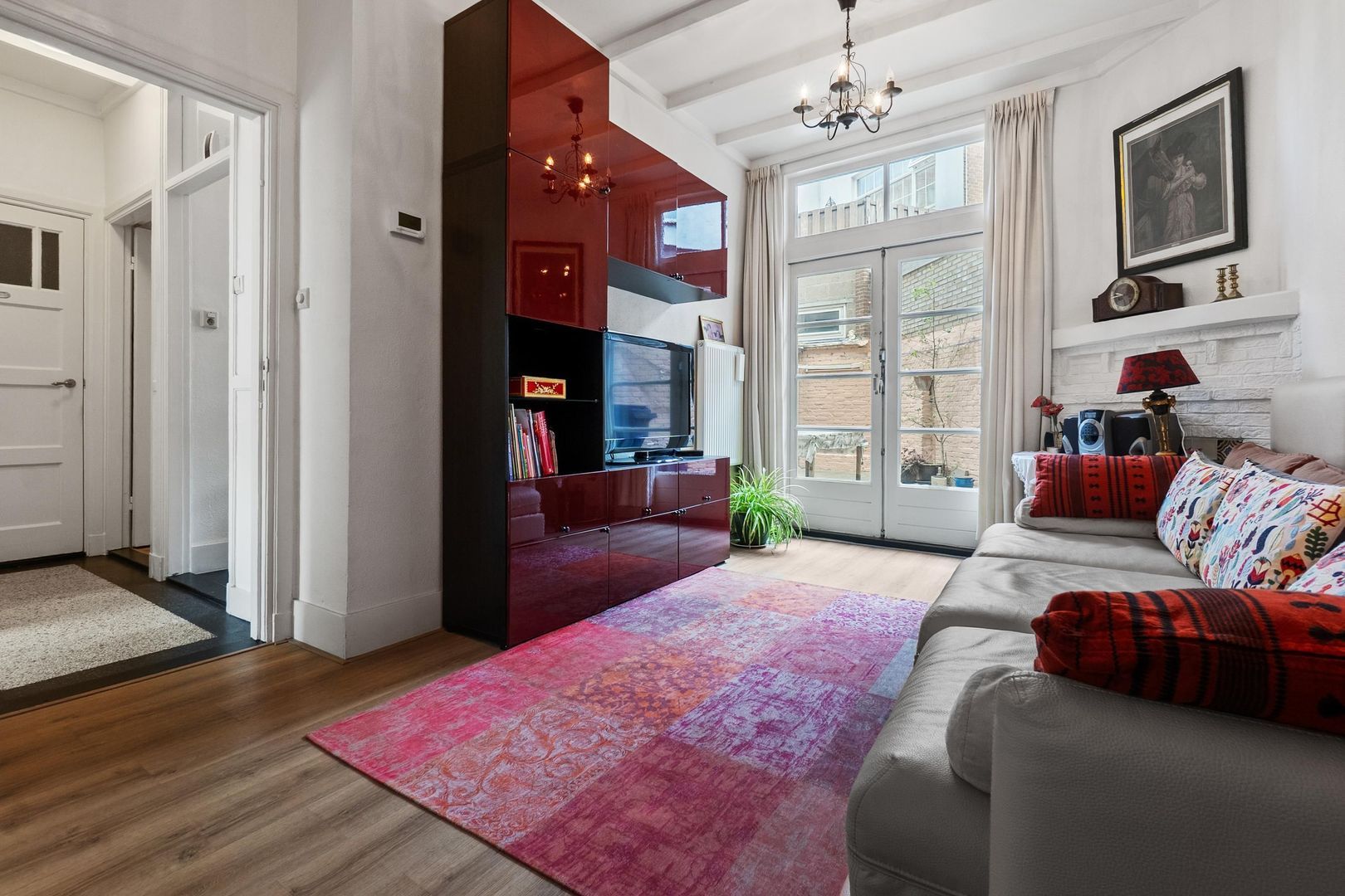 De woning heeft een indeling met entree, eetkamer met pantry en doorgang naar een hal met twee kamers, waarvan de voorkamer is ingericht als slaapkamer. De aantrekkelijke woonkamer heeft openslaande deuren naar de tuin, en de keuken is uitgerust met een kookplaat en vaatwasmachine. De badkamer beschikt over een douche en dubbele wastafels. Met een gebruiksoppervlakte van circa 63 m² en een actieve Vereniging van Eigenaren, biedt deze woning een comfortabele levensstijl.