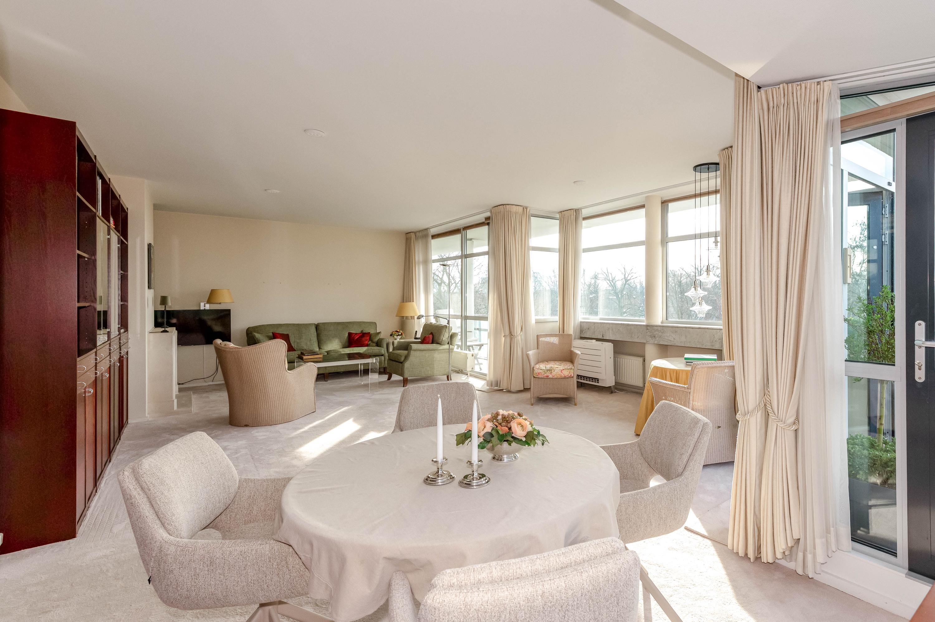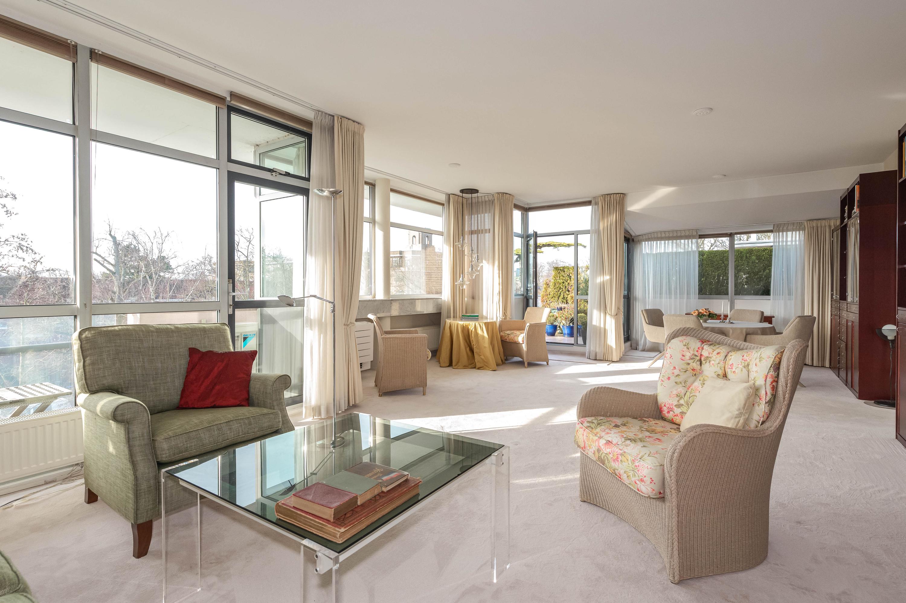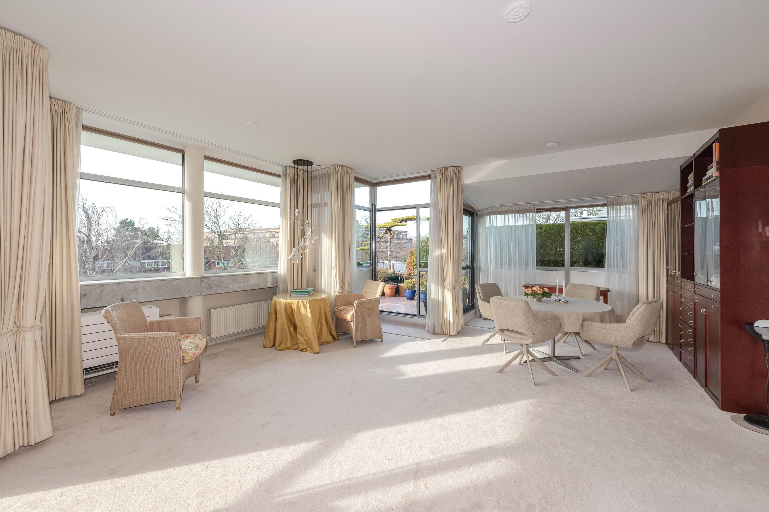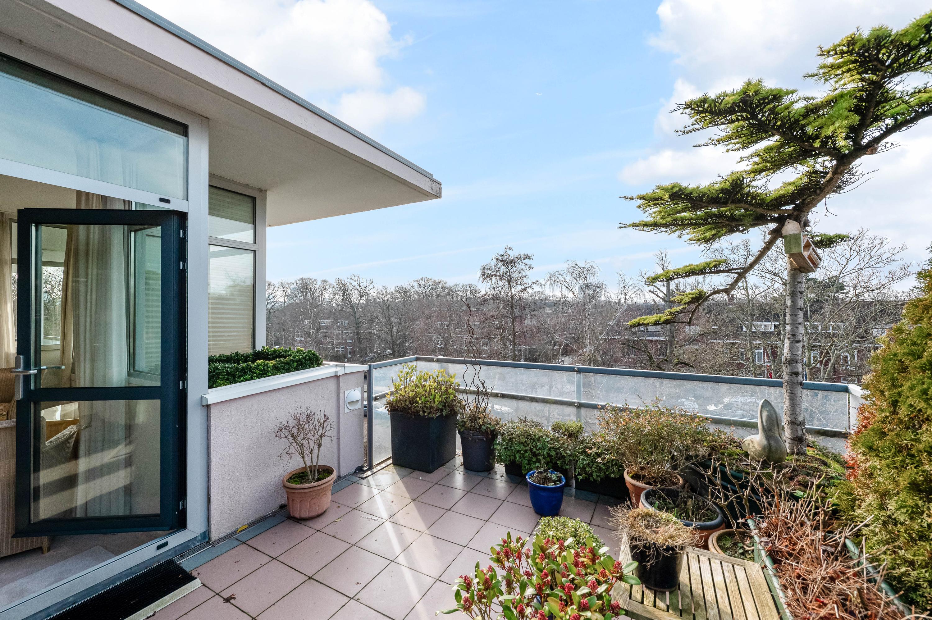 In het moderne appartementencomplex Bosjes van Zanen bevindt zich dit 5-kamerpenthouse van ca. 130 m², met 3 slaapkamers en 2 verbonden terrassen. U hebt ook toegang tot uw eigen parkeerplaats in de onderliggende parkeergarage en een bijzonder praktische berging. Het appartement is gelegen op een afgesloten terrein dat bereikbaar is via een brug, met uitzicht op het fraaie Park Clingendael. Binnen loop- en fietsafstand vindt u groen, openbaar vervoer en winkels. Bij binnenkomst via de centrale hal leidt de lift naar de derde verdieping. De ruime hal geeft toegang tot de woonkamer met open haard, de keuken en de slaapkamers. De master bedroom heeft een badkamer en er is een gastenbadkamer aanwezig. Dit penthouse biedt comfort met een cv-ketel uit 2023 en mechanische ventilatie.