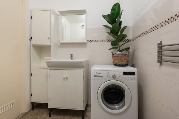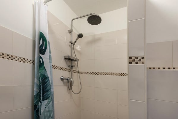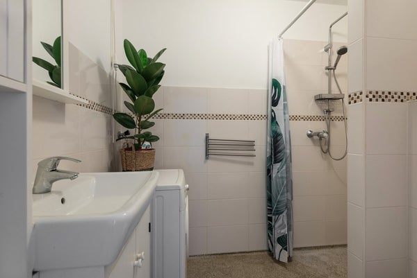 De badkamer is functioneel ingericht en voorzien van een inloopdouche, wastafelmeubel en wasmachineaansluiting. Hier bevindt zich tevens het toilet.