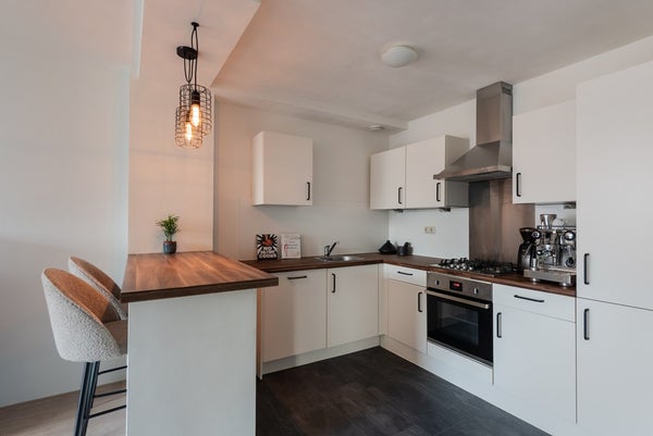 De open keuken is praktisch opgesteld en voorzien van een koel-/vriescombinatie, vaatwasser, oven en 4-pits gasfornuis. De keuken beschikt daarnaast over een gezellige eetbar die een leuke verbinding vormt tussen koken en wonen.