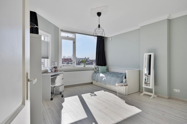 Dit ruime duplex appartement in de Bomenbuurt heeft 7 kamers en biedt een unieke kans. Gelegen op de 2e en 3e verdieping van een pand uit 1921, is het centraal gelegen en op loopafstand van de Fahrenheitstraat. De indeling omvat een entree via een open portiek, een licht ingerichte hal met hoge plafonds en grote ramen. Het appartement heeft een moderne badkamer, een apart toilet, een ruime studeerkamer, een woon-eetkamer en een nieuwe keuken (2023) met inbouwapparatuur. Van zowel de keuken als de studeerkamer is er toegang tot het noordwestelijk balkon, ideaal voor middag- en avondzon. De derde verdieping heeft 4 slaapkamers, een tweede badkamer en een riante dakterras van 33 m². Dit appartement heeft een energielabel A, twee badkamers, is goed onderhouden en biedt airconditioning en zonnepanelen.