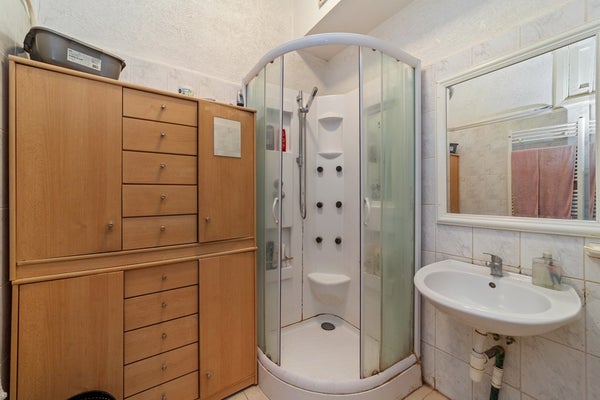 Tussengelegen eenvoudige badkamer met douche en wastafel.
