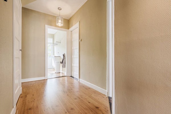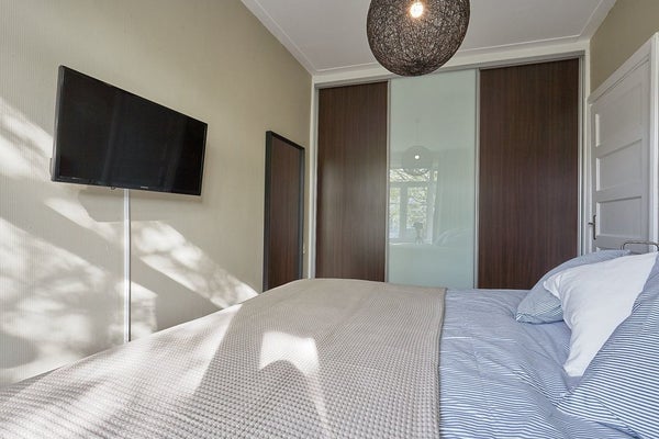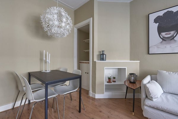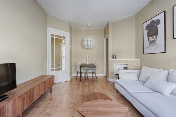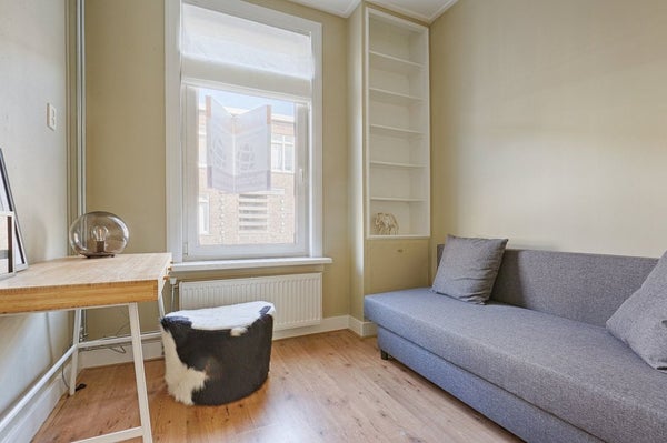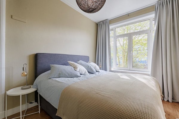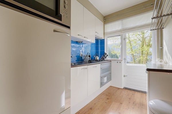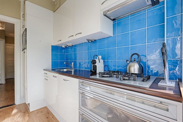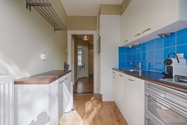 Via een verzorgde portiektrap bereik je de eerste verdieping, waar dit sfeervolle appartement zich bevindt. Bij binnenkomst tref je een ruime hal die toegang biedt tot de lichte woonkamer aan de voorzijde. De keuken is voorzien van een koelkast met vriesvak, oven, vaatwasser en gasfornuis met afzuigkap, en biedt toegang tot het zonnige balkon op het zuiden.