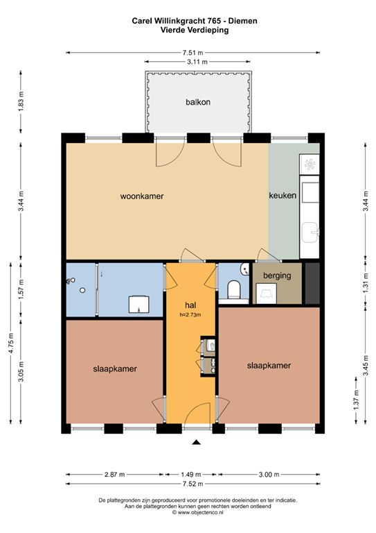 - De galerijflat heeft een woonoppervlakte van 62 m² en beschikt over 3 kamers, waarvan 2 slaapkamers;
