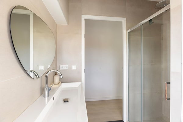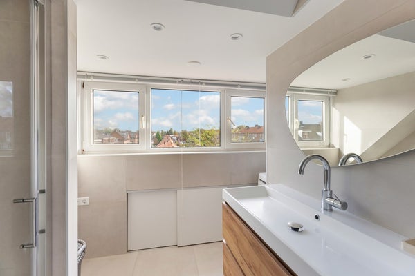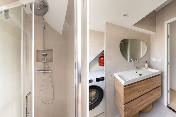 De badkamer is stijlvol en modern ingericht met beige wand- en vloertegels, een hout-look wastafelmeubel met organische spiegel, een douchecabine met regendouche. Ook hier is het plafond voorzien van inbouwspotjes. In deze ruimte bevindt zich tevens de opstelling voor de wasmachine en cv-ketel (Intergas HRE, 2022).