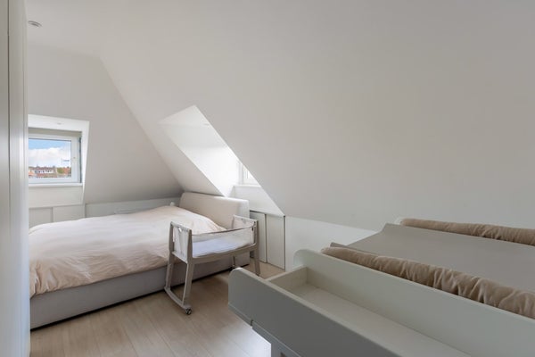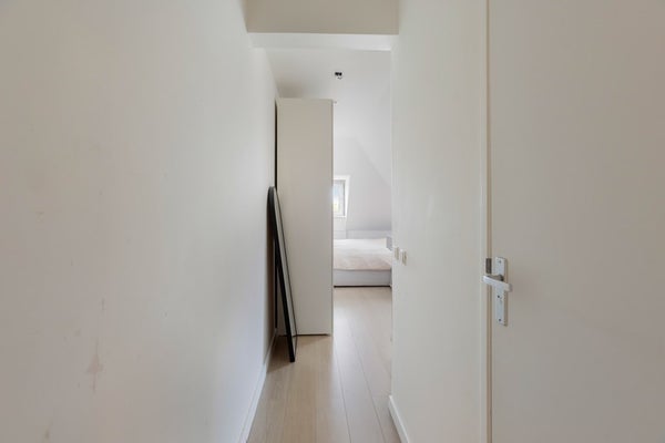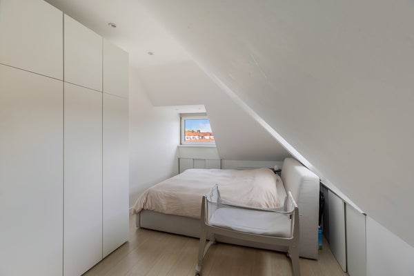 De slaapkamer ligt onder het schuine dak, wat zorgt voor een knusse en sfeervolle uitstraling. Ook hier ligt laminaat en zijn de muren wit afgewerkt. Onder de schuinte is praktische opbergruimte gecreëerd. Ook hier zorgen de inbouwspotjes voor een moderne uitstraling. De kamer is groot genoeg om eventueel een extra werkruimte te creëren.