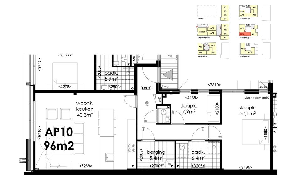 - De galerijflat heeft een woonoppervlakte van 96 m² en beschikt over 3 kamers, waarvan 2 slaapkamers;