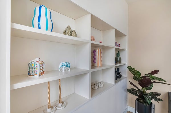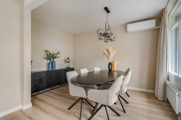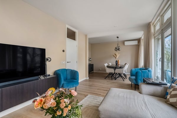De woonkamer is een echte eyecatcher: heerlijk licht dankzij de grote raampartij en modern afgewerkt. Er is een fraaie vakkenkast gerealiseerd voor decoratie en persoonlijke accenten, wat zorgt voor een stijlvolle uitstraling. De ruimte biedt volop mogelijkheden voor zowel een comfortabele zithoek als een eethoek. Vanuit de woonkamer heb je toegang tot het balkon op het zuiden. Daarnaast is de woonkamer voorzien van airconditioning, wat zorgt voor extra comfort.