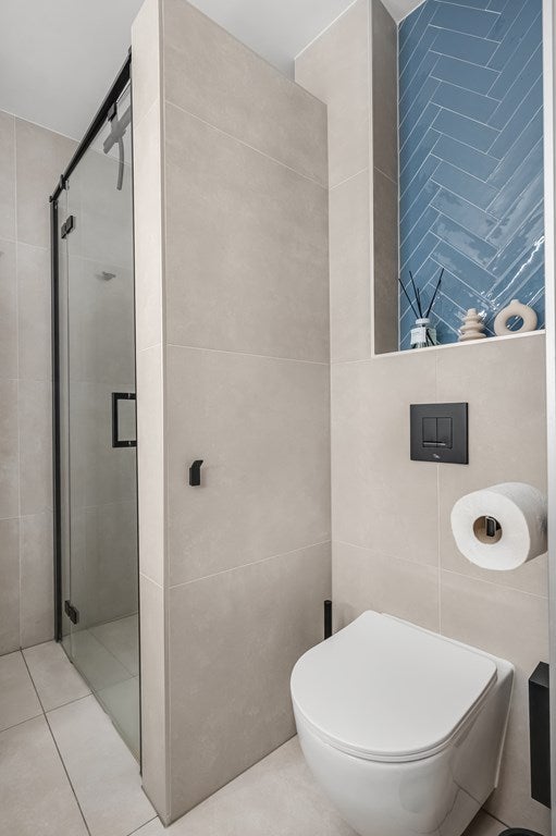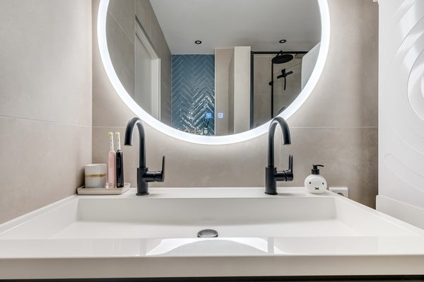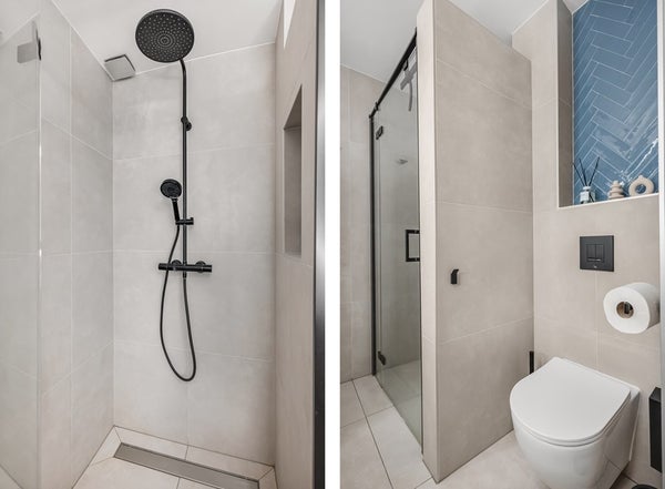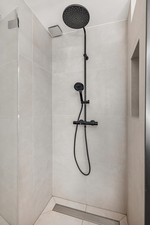 Aansluitend vind je de strak afgewerkte moderne badkamer (2023), volledig betegeld en modern uitgevoerd met zwarte kranen. De badkamer beschikt over een douche, toilet, wastafelmeubel én de aansluiting voor wasmachine en droger.