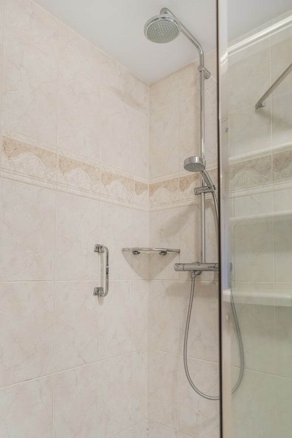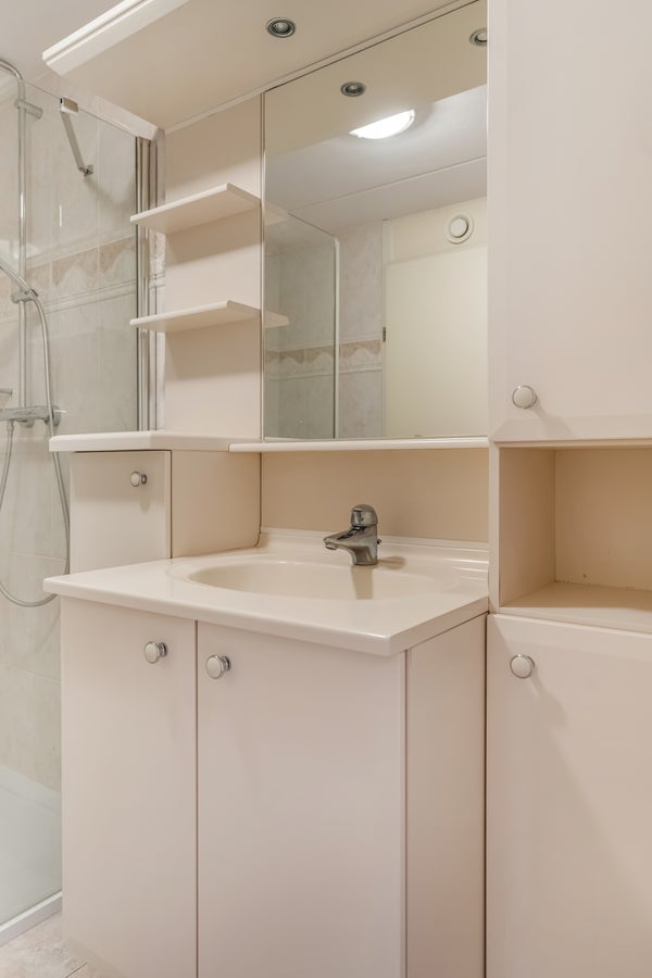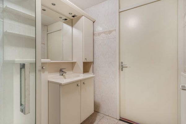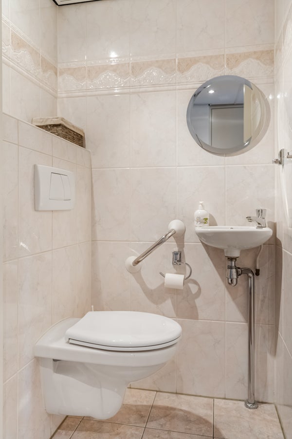 In de badkamer is de ruimte ingedeeld met een ruime douche (lage instap), en een badmeubel met wastafel. Dankzij het gebruik van lichte kleuren oogt de badkamer heel ruimtelijk. Naast de badkamer is de toiletruimte, uitgevoerd in dezelfde stijl. In de inpandige berging kunnen de wasmachine, droger, strijkplank en andere spullen staan.