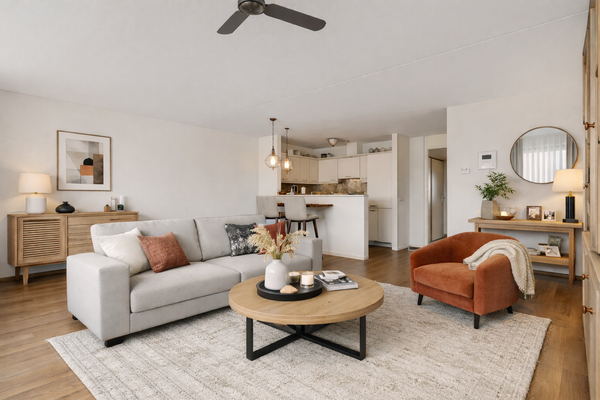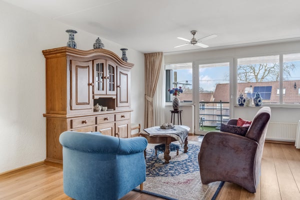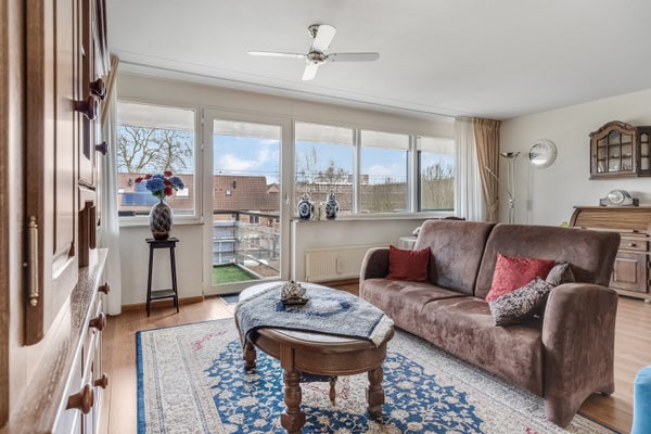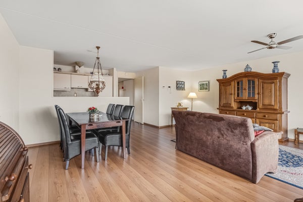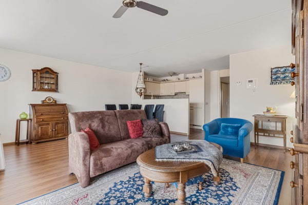 Aan de voorzijde is de woonkamer, met fijne lichtinval vanaf de oostkant. Met een oppervlakte van circa 31 m2 is er genoeg plek voor een zithoek, een wand/tv-meubel, de eettafel en je favoriete woonaccessoires. Het aansluitende balkon is groot genoeg om met een paar mensen buiten te zitten.