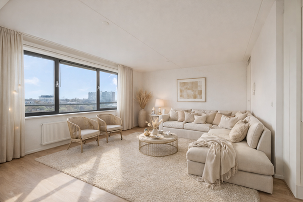 De woonkamer heeft veel lichtinval vanaf de oost- en de zuidkant, perfect voor de ochtend- en middagzon. Het uitzicht is fraai, over vele lagere gebouwen en de boomtoppen. Je kunt zelfs de contouren van het Proosdijpark zien!